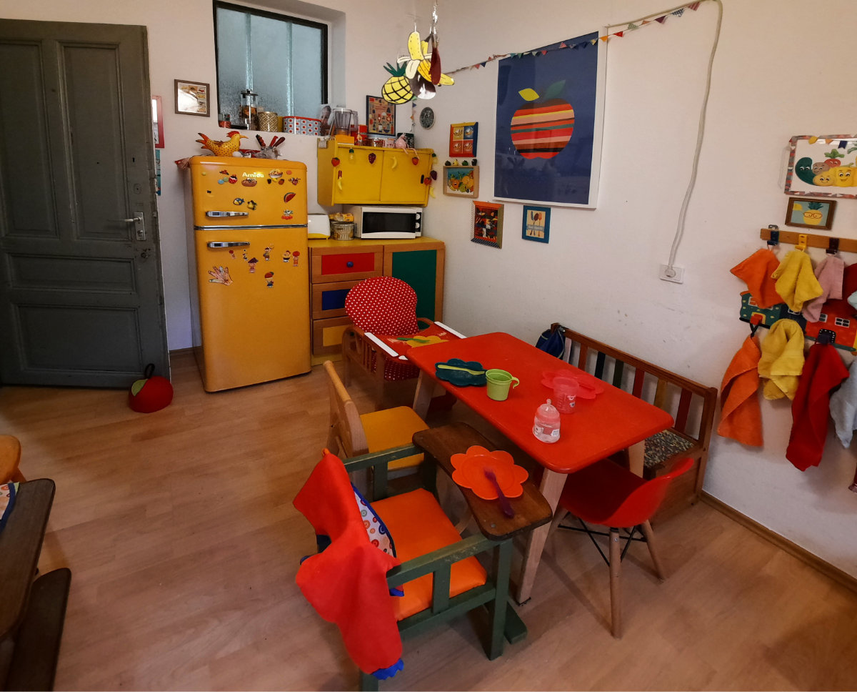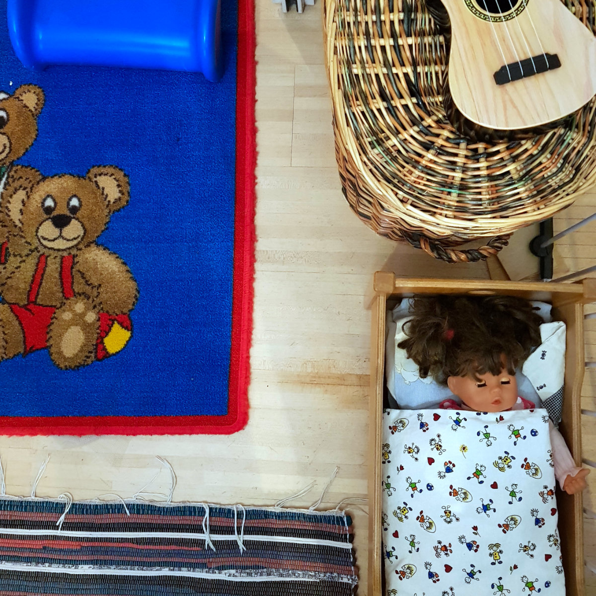 Verschiedene Spielstationen (z.B. der Kaufladen, die Musikecke, die Leseecke, der Basteltisch) bieten vielfältige Spiel- und Lernangebote. Die Küche ist kindgerecht eingerichtet und lädt zum gemeinsamen Essen in einer farbenfrohen Umgebung ein. Durch eine liebevolle und themenbezogenen Auswahl von Dekorationsobjekten (Bilder, Mobiles) gibt es immer etwas zu entdecken.